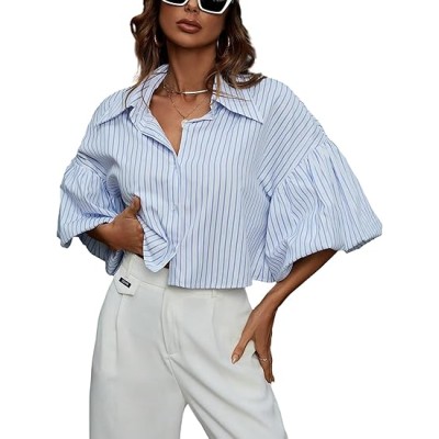 Women's Casual Striped Puff Sleeve Drop Shoulder Button Up Shirt Crop Blouse Tops
