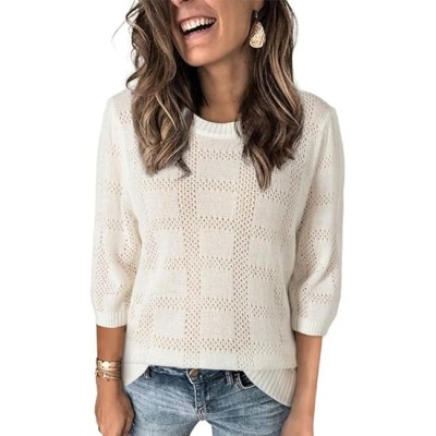 Womens Summer Sweater 2025 Spring Tops Short Sleeve Casual Blouses Crewneck Hollow Out Knit Pullover Shirt