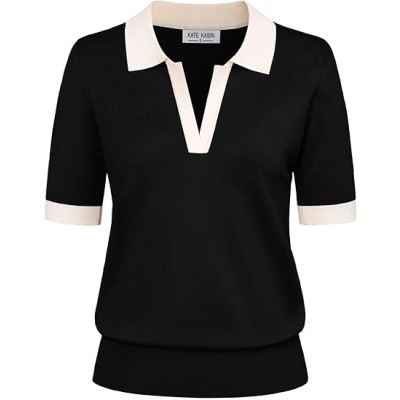 Women Short Sleeve Polo Sweater V Neck Knitted Tops Casual Ribbed Shirt Loose Pullover Sweater