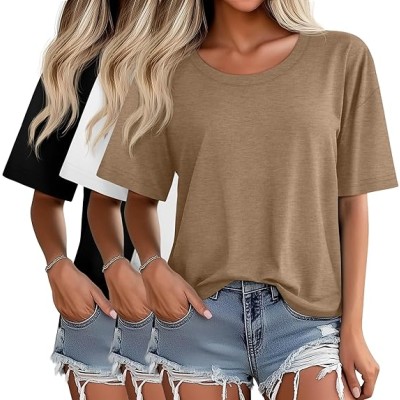 3 Pack Women's Oversized Half Sleeve T Shirt Crew Neck Cotton Elbow Length Tops Loose Fit Casual Summer Basic Tees