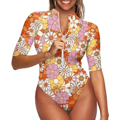 Women's One Piece Swimsuit High Cut Athletic Swimwear Half Sleeve Zipper Tummy Control Bathing Suits Size XS-2XL