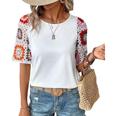 Crochet Tops for Women Crewneck Shirt Floral Short Sleeve Casual Pullover Blouse Summer Tops