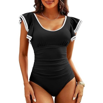 One Piece Swimsuit for Womens Sexy Ruffle U Neck Flounce Ruched Tummy Control Cut Out Bathing Suits Swimwear