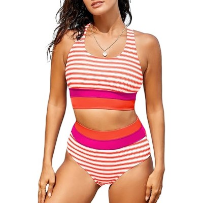 Women's High Waisted Bikini Sets Two Piece Swimsuits Color Block Scoop Neck Bathing Suits