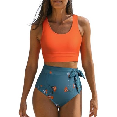 Womens 2 Piece Swimsuit Scoop Neck Sleeveless 2025 Racerback Top Tummy Control Tie Knot Bathing Suits Floral Bottoms