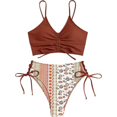 Women V Neck Bikini Set Ruched Tie Front High Waisted Floral Print Ribbed 2 Piece Bathing Suit Swimsuits