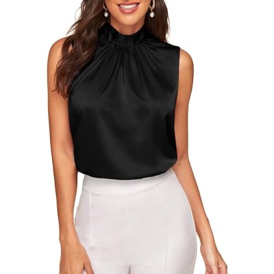 Women's Elegant Tie Back Sleeveless Pleated Mock Neck Satin Blouse Top