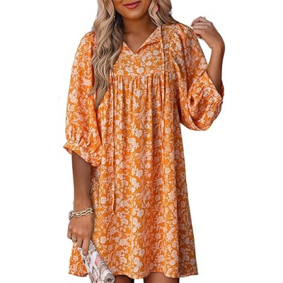 Womens Summer Dresses 2025 Boho Floral Drawstring V Neck Chiffon Lantern Sleeve Beach Vacation Mini Dress Sundress