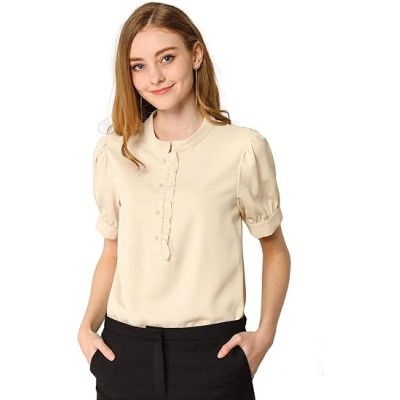 Women's Vintage Office Blouse Tops Half Placket Puff Sleeve Ruffled Shirt
