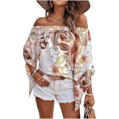 Women's Off Shoulder Shirred Half Sleeve Loose Striped Blouse Shirt Top