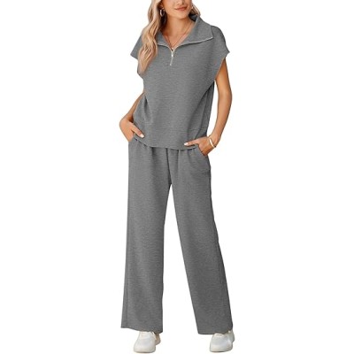 Womens Two Piece Outfits Sleeveless Pullover Tops and Wide Leg Pants Half Zip Jogger Lounge Sets