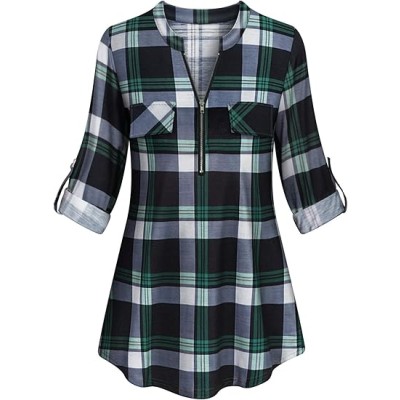 Womens Casual Long Sleeve Zipped V Neck Plaid Tunic Blouses