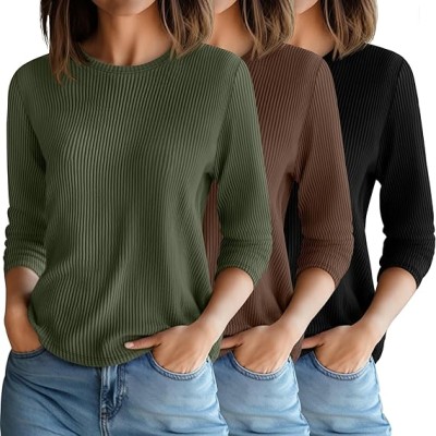 3 Pack Ribbed Knit 3/4 Sleeve Tops for Women Round Neck Basics Tees Casual Trendy Loose Fit T Shirts Blouses