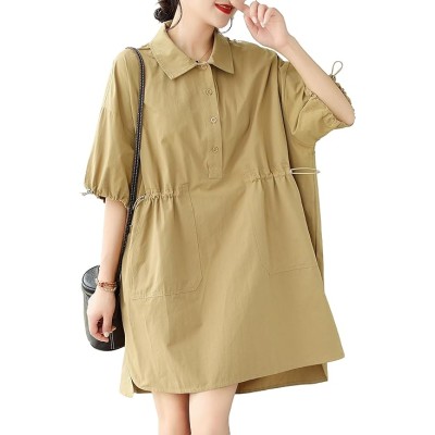 Women's Half Sleeve Polo Collar Solid Color Button Down High Low Tunic Dress Shirts GA2689