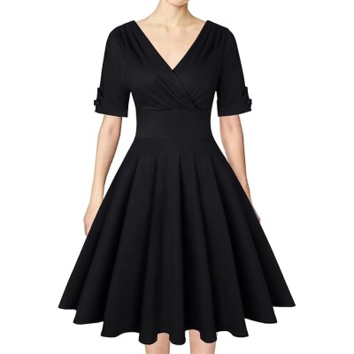 Women's 1950s Vintage Wrap V Neck Half Sleeve Retro Cocktail Swing Dress Plain A-line Dresses