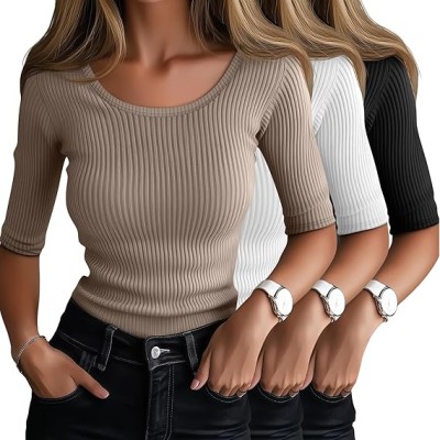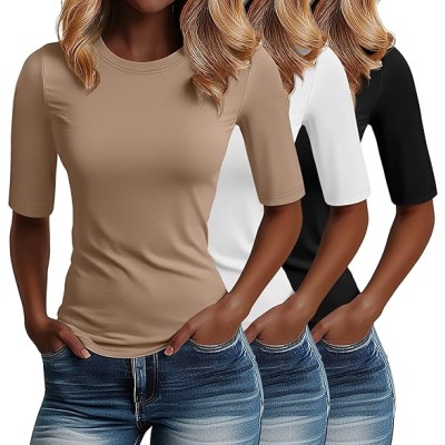 3 Pack 1/2 Sleeve Tops for Women Half Sleeve Scoop Neck T Shirts Ribbed Slim Fit Casual Elbow 2025 Summer Basic Tee