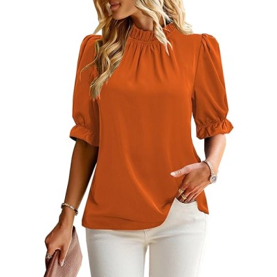 Women's Summer Boho Floral Shirt Top Ruffle Mock Neck Puff Short Sleeve 2024 Casual Blouses