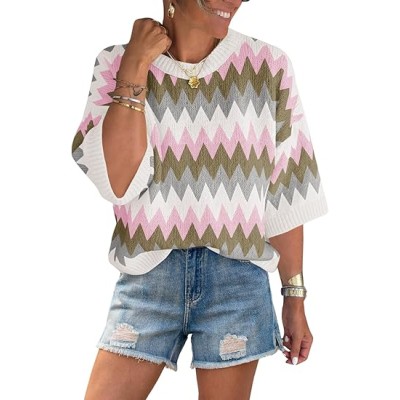 Womens Color Block Striped Sweater Tops Summer Half Sleeve Crew Neck Loose Knit Pullover Sweaters