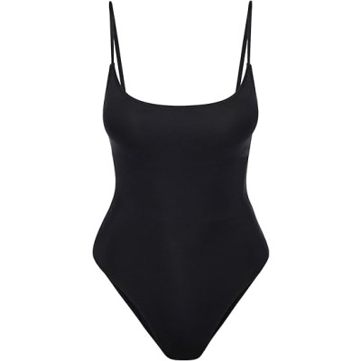 Women's One Piece Swimsuit Ribbed Open Back Bathing Suit Tummy Control Scoop Neck Adjustable Straps High Cut Swimwear