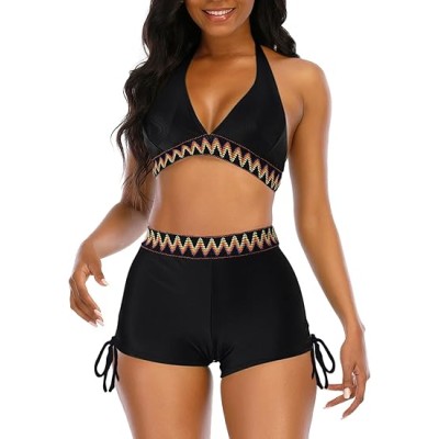 Womens High Waisted Swimsuits with Boy Shorts Brazilian Triangle Top Stripes Halter Bikini Two Piece Bathing Suits
