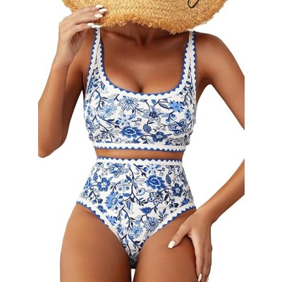 Women's High Waisted Floral Bikini Sets Swimsuit Suit for Women 2025 Tummy Control Bathing Suit Swimwear for Summer