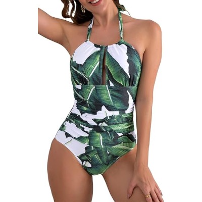 Women V Neck One Piece Swimsuit Halter Backless Ruched Tummy Control Bathing Suit