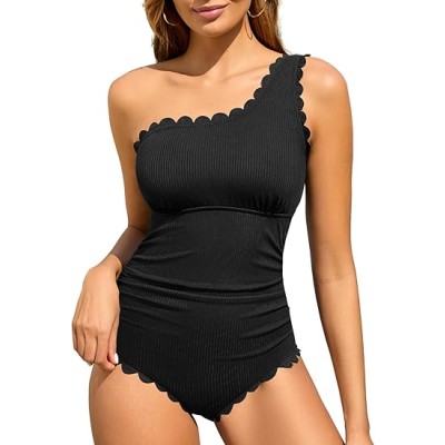 One Shoulder Women's One Piece Swimsuit Ribbed Scalloped Swim Suits Slimming Full Coverage Modest Bathing Suit