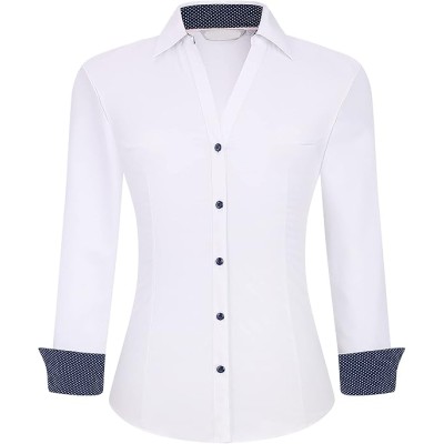 Womens Button Down Shirt Long Sleeve Work Dress Shirts, V Neck Easy Care Stretchy Business Casual Blouses for Women