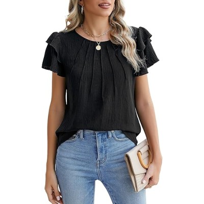 Womens Dressy Casual Blouses Cap Ruffle Sleeve Summer Tops Business Work T Shirts Basic Pleated Tunic 2025
